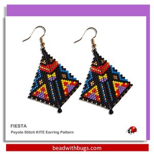 FIESTA is a Peyote Stitch beaded earring pattern in a Kite Shape which is often referred to as a Shield Shape or Arrow Shape. This earring finishes at 1.75 inches tall and 1.25 inches wide. Please note that this is not a beginner pattern as it requires some understanding of odd count peyote and a herringbone stitch.